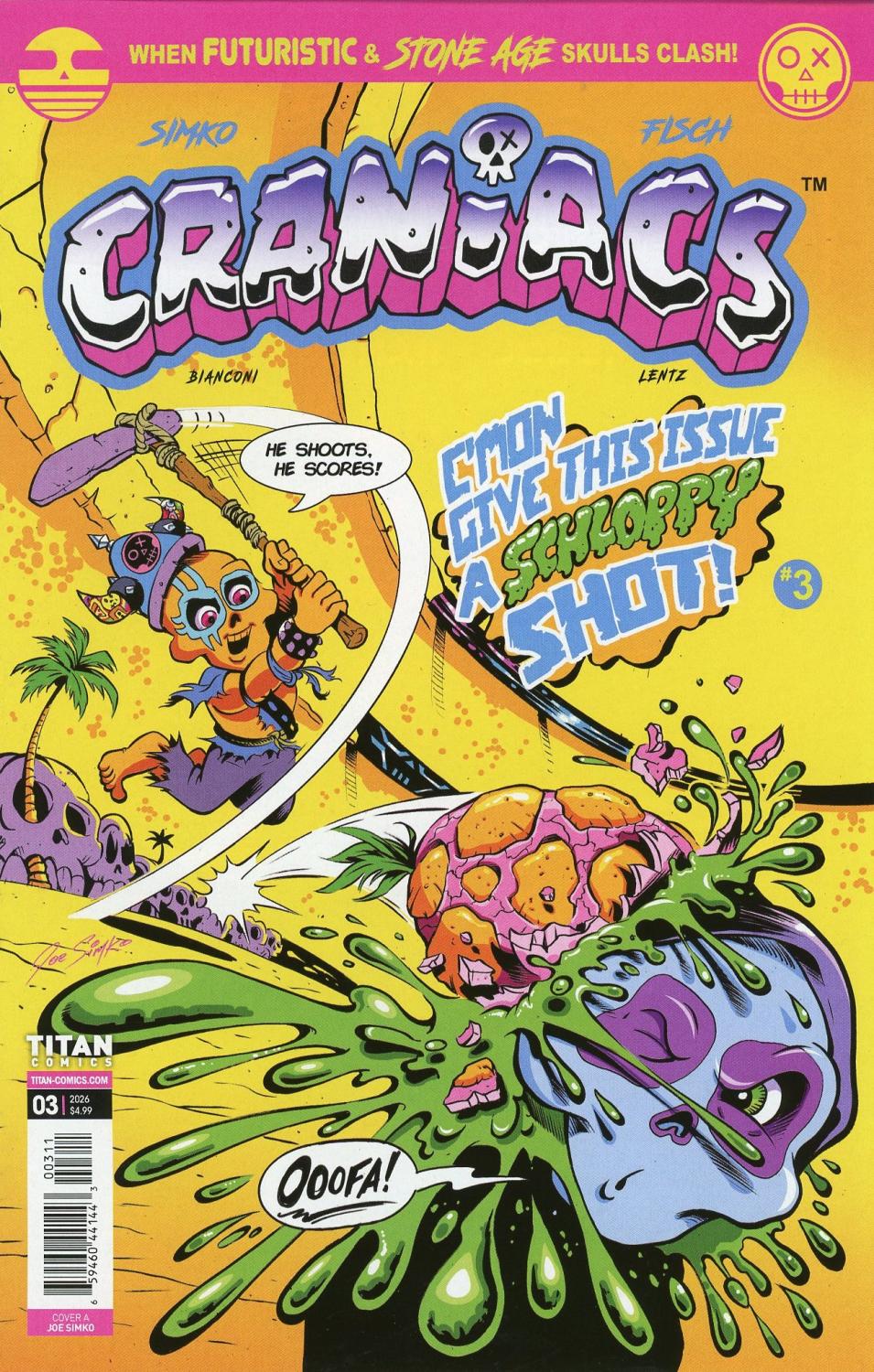 Debut comic based on the hit Craniacs trading cards created by lead Garbage Pail Kids card artist Joe Simko and Topps senior executive Ira Friedman! Craniacs TV series in active development from animation studio Titmouse (Spider-Man: Across the Spider-Verse)! Written by Sholly Fisch (Batman, Superman, Scooby-Doo), with stunning artwork by Garbage Pail Kids artist Joe Simko. Two planets collide forming one world. Two distinct skull-faced societies split down the middle. One side is wild & stone age named RETROVIA; the other side is systematic & ultra-futuristic named FUTERRA.
