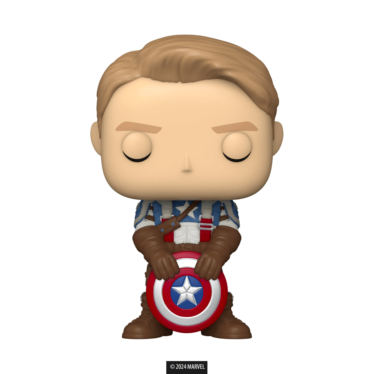 The Funko Pop of Captain America features the first Avenger holding his shield as he’s looking down stoically.